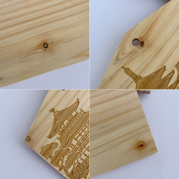 弊社の絵馬に使用されている檜は、間伐材を使用しており、葉節が所々に見られます。