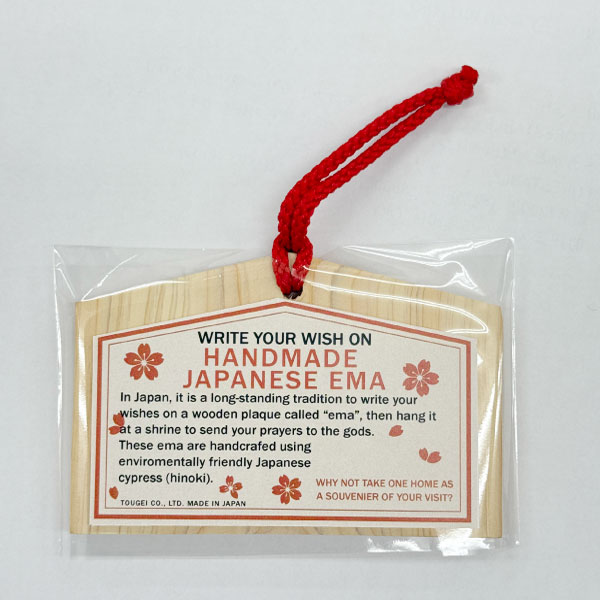 日本の檜の間伐材で作られた、手作りの絵馬型アクセサリー。